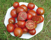 Fleischtomate mit runden, dunklen Früchten, 80 bis 150 g. Mittelfrüh reifend. Guter mild-süßer Geschmack, sehr gut zum So-Essen.