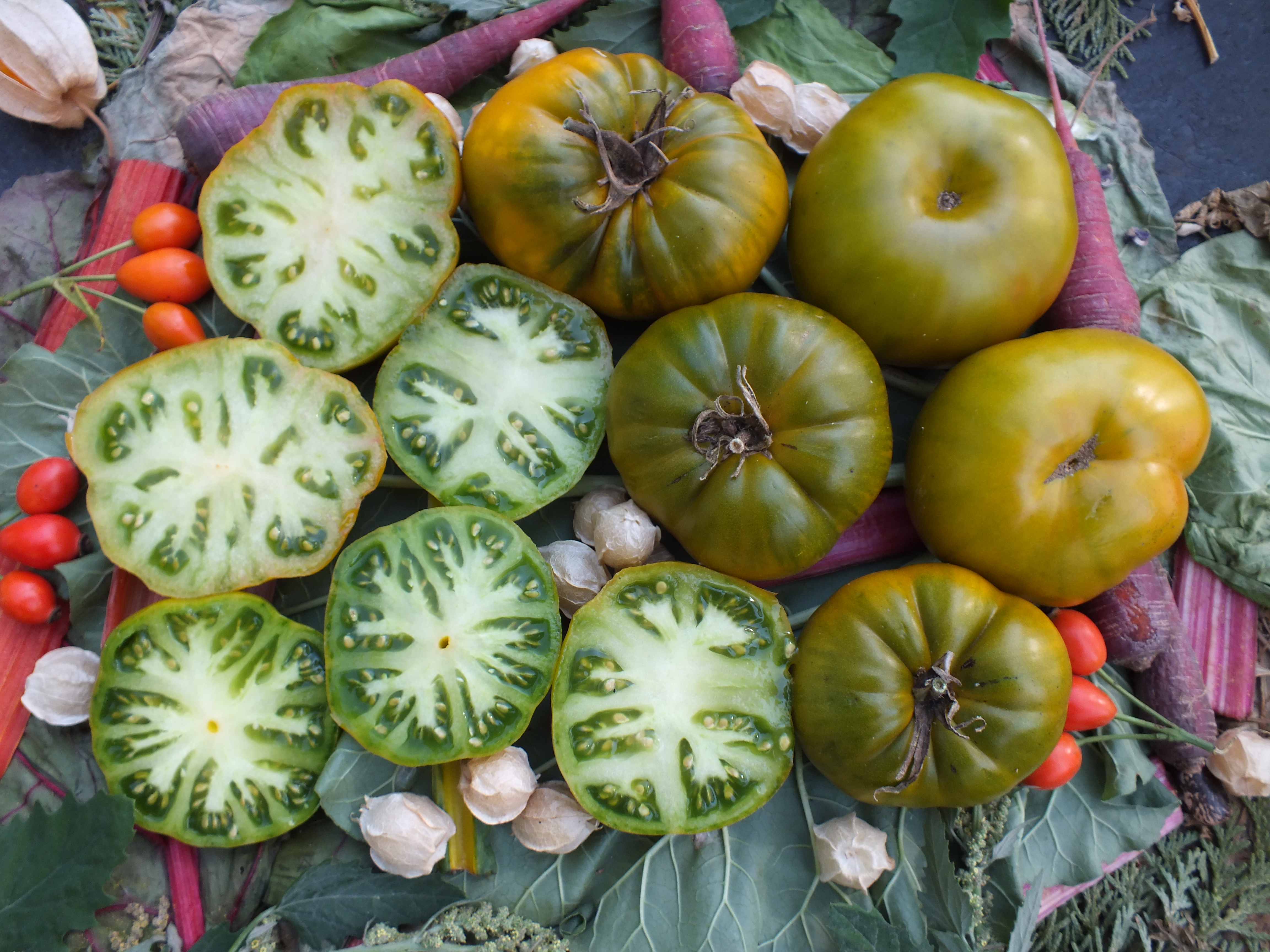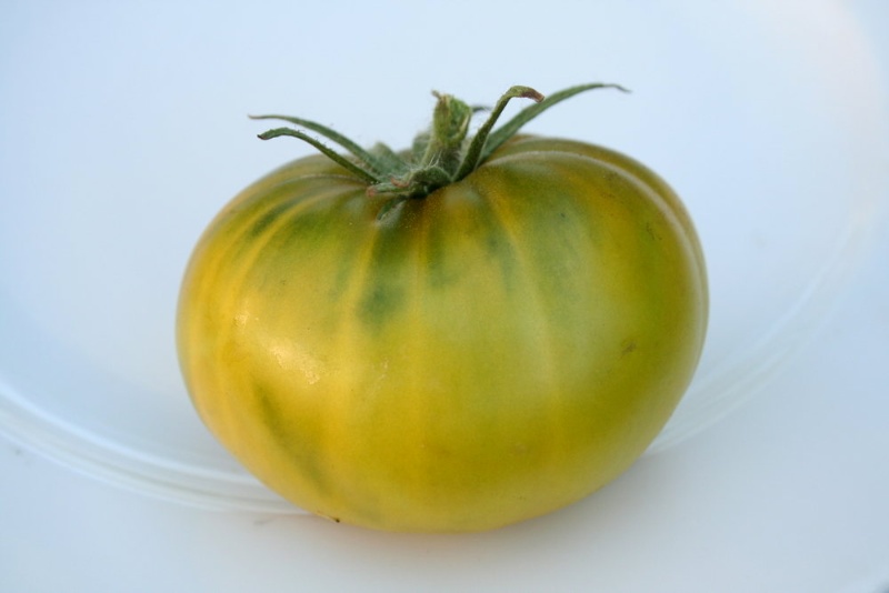 Mittelfrühe Stabtoamet mit gelbgrünen, recht süßen und saftigen Früchten. Mittelgroße, platte Fleischtomate mit leichten Rippen, etwa 100 g,
