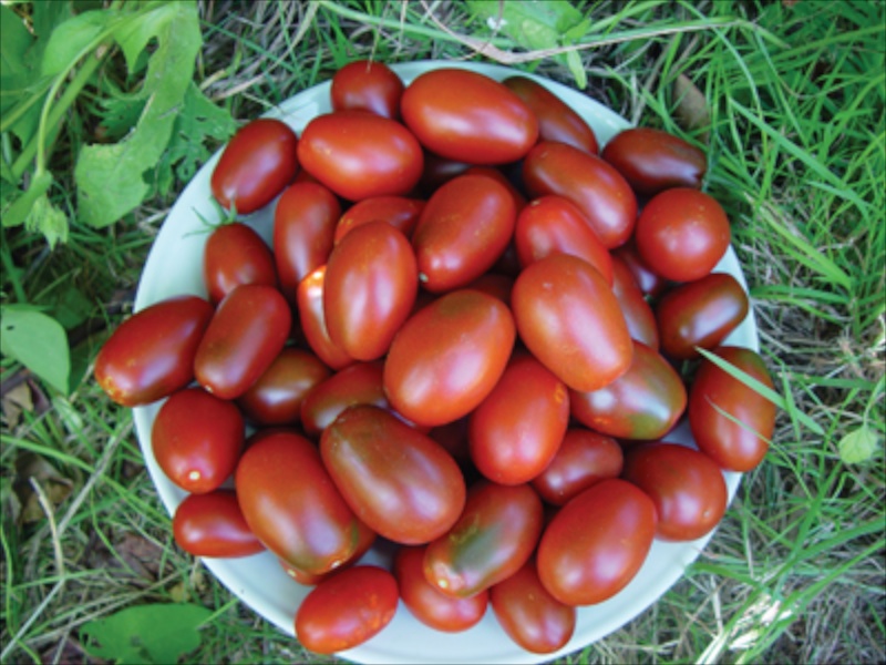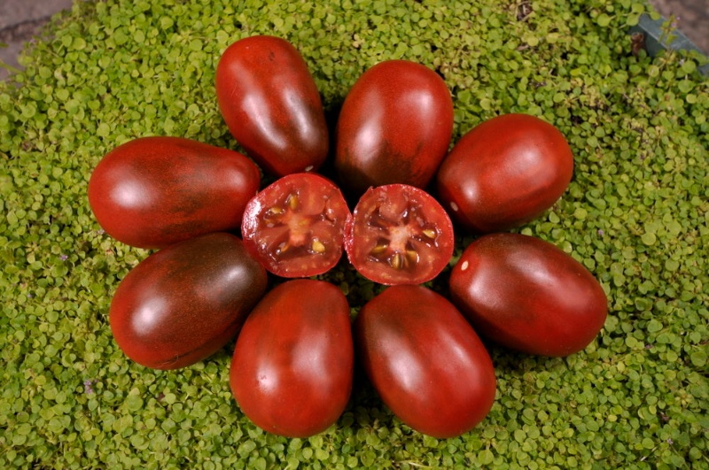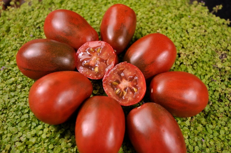 Russland. Oval, ca. 60g. Rispen. Tiefschokoladenbraun. Hoher Ertrag. Platzfest. Stabtomate. Süß. 70-80 Tage. Inhalt: mindestens 15 Korn