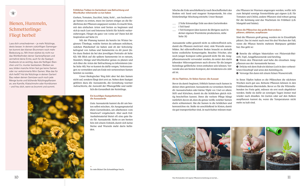 Saatguternte und Stecklingsvermehrung: Zauberei? Wenn du zusiehst, wie dein Samenkorn zur Pflanze reift, kommt dir das gar nicht so abwegig vor. Dabei geht es doch ganz leicht! Die Autorin Sigrid Drage liefert dir alle Infos und Tipps, die du brauchst, um an Ende die ertragreichsten, resistentesten und die am besten an deinen Garten angepassten Samen und Stecklinge weiterzupflanzen. Ganz natürlich und schonend, versteht sich – und ganz nach den Prinzipien der Permakultur. Angefangen mit den Basics: wie sollst du deine Pflanzen am besten aussäen, vorziehen, anpflanzen und pflegen? Und natürlich: alles rund um Bestäubung, Befruchtung, generative und vegetative Vermehrung. Grundlagen abgehakt? Dann kann es gleich weitergehen: mit ausführlichen Portraits zu 50 Gemüsen, Kräutern, Blumen und Beeren, die du ganz unkompliziert vermehren und auch wirklich gebrauchen kannst. Da wären etwa der knollig-aromatische Fenchel, die wuchernde Buschbohne, die bunt-bauchige Aubergine oder die Kräuter-All-Time-Favorites Rosmarin und Basilikum. Um an deine eigenen Sorten zu kommen, suchst du dir gleich ein paar Verbündete. Samentauschbörse? Ja bitte! Die wird ab jetzt zu einem festen Bestandteil deines Gartenjahres.