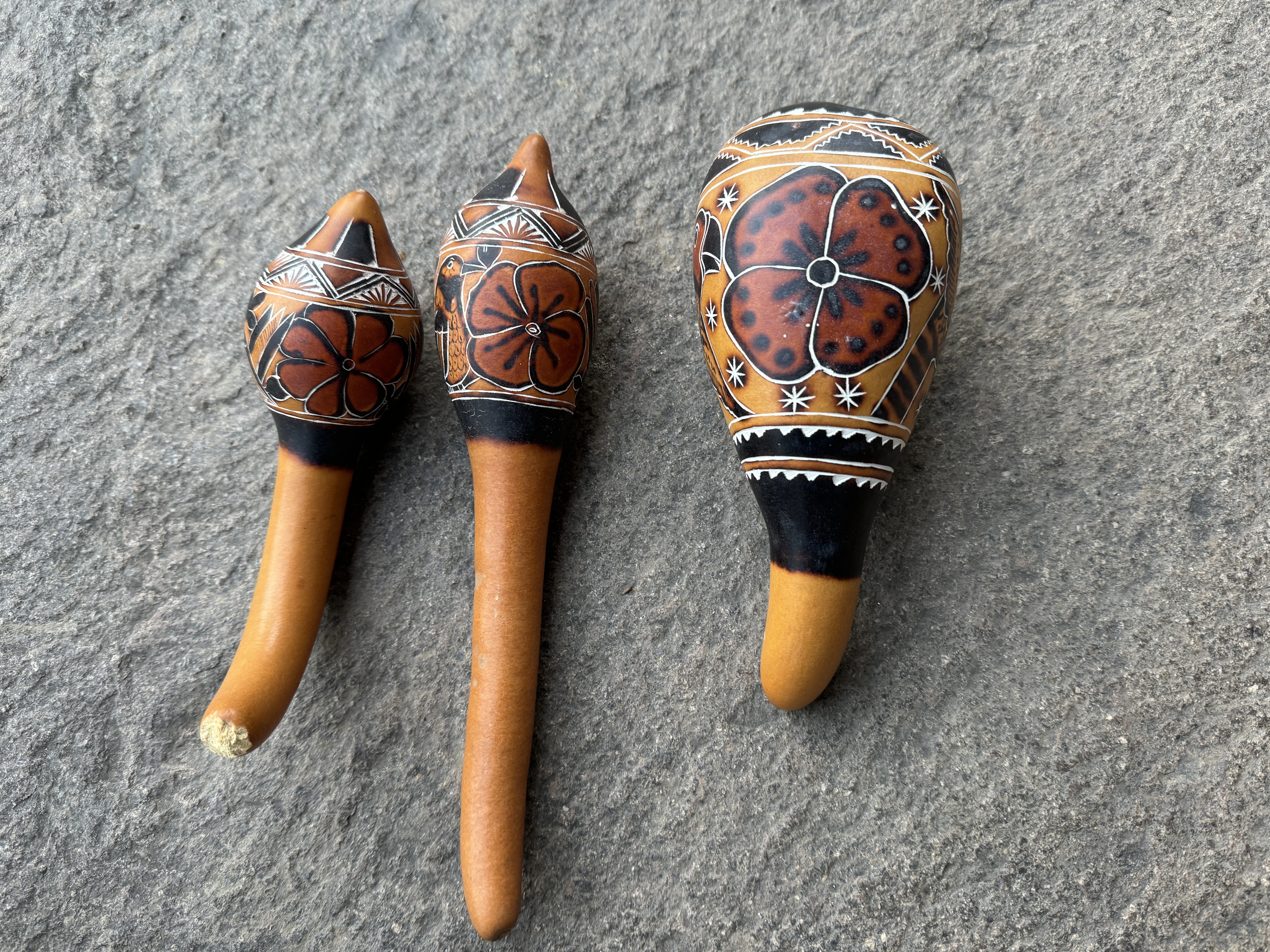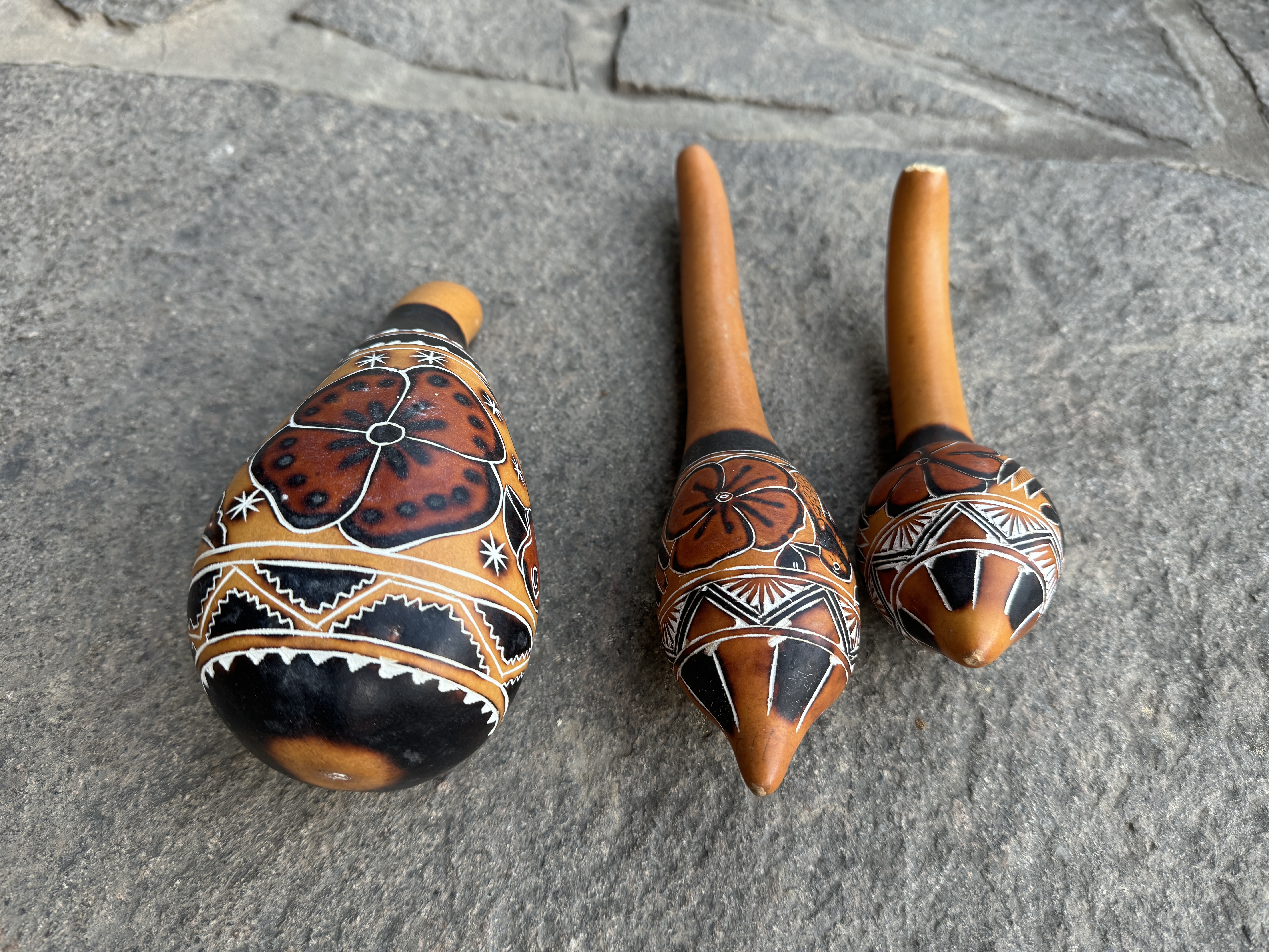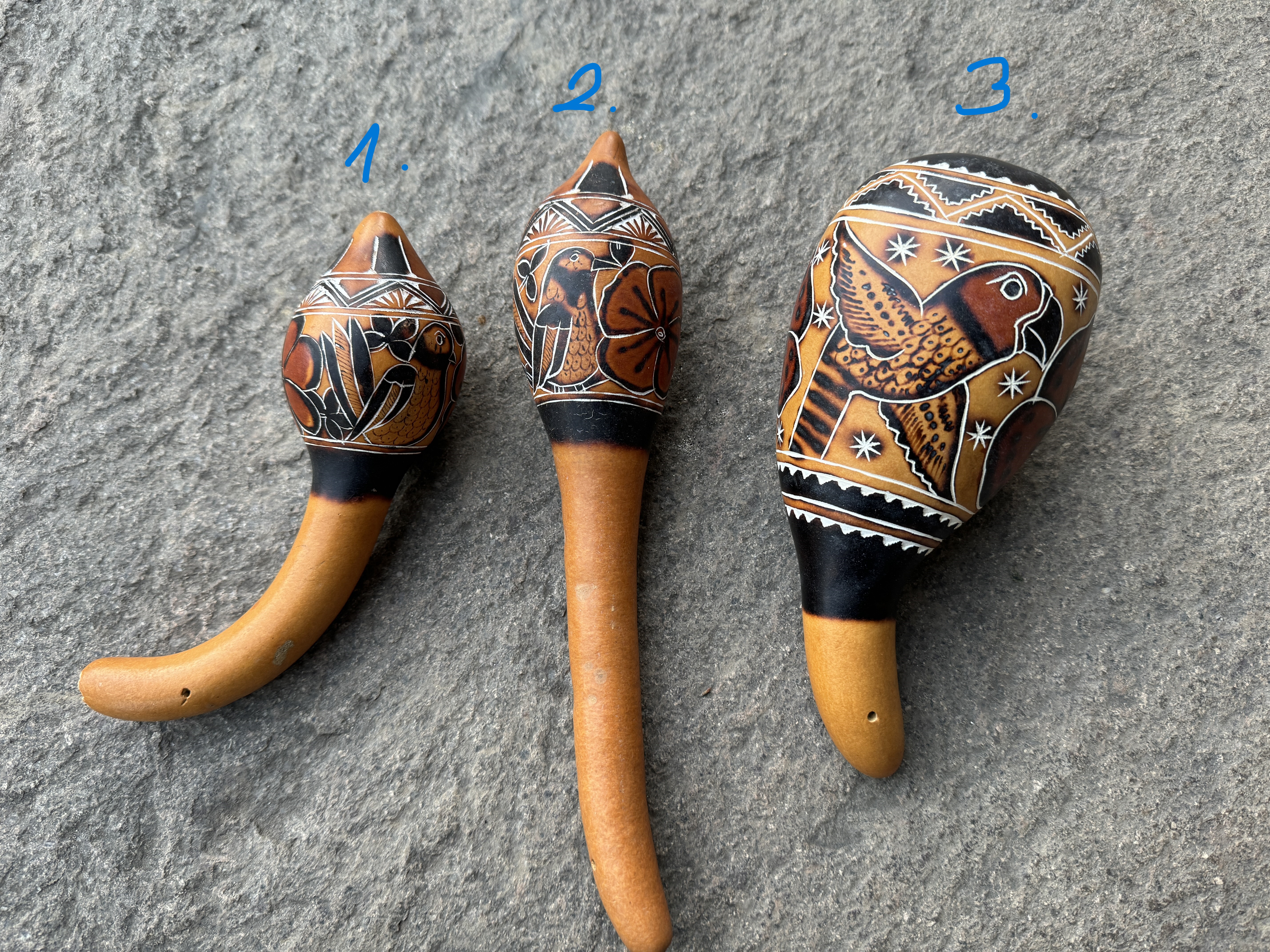 Kalebassen Rassel direkt aus Peru handgefertigt von Indianern in Peru, nicht gefärbt, nur gebrannt, daduch entshen verschiedene Farbtöne und Muster. Schamanische Rassel, auch geeignet als Percussion Instrument oder für Kleinkinder, da völlig ungiftig. Bei Bestellung bitte ungefähre Größe angeben. von 6 cm bis 25 cm erhältlich.