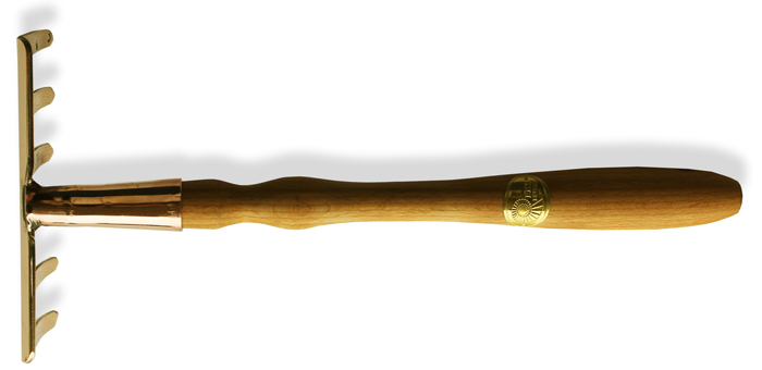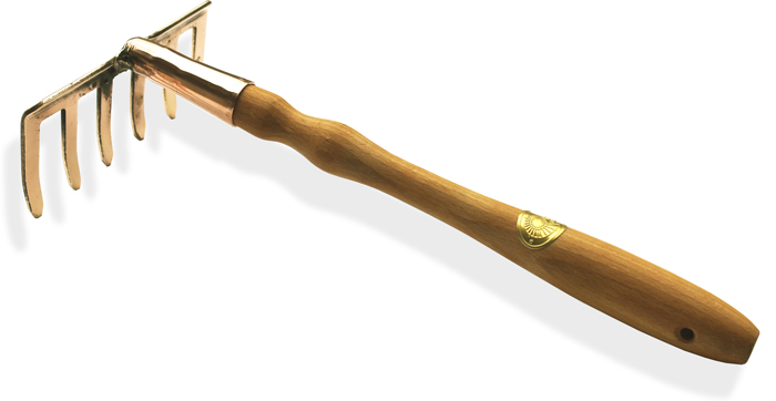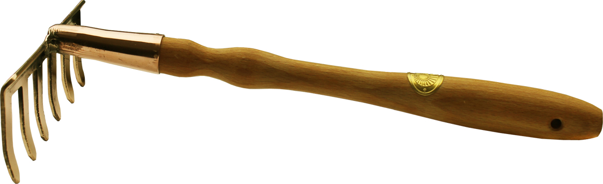 Kleiner handlicher Rechen zum Lockern und Anebnen. Massive Kupferlegierung, Griff aus Buchenholz.
