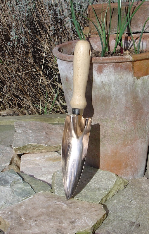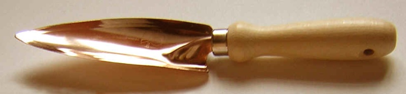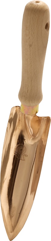 Handschaufel "Mira" schmal Elegant und effizient beim Ausstechen langer Wurzeln Massive Kupferlegierung, Griff aus Buchenholz 31 cm lang 5 cm breit Gewicht 200 g
