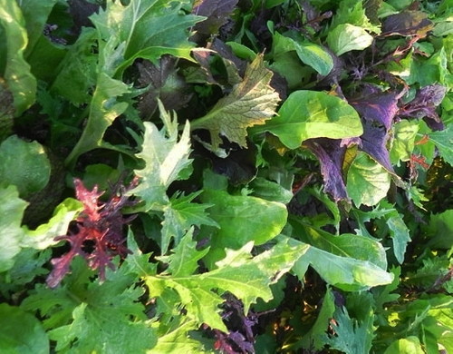 Mischung von ca. 10 japanischen Senfsorten, u.a. Yukina Savoy, Mizuna, Mizuna Purple, Pink Lettucy Mix, Scarlet Ohno Revivel, sowie aus Kreuzungen dieser Sorten. Ein Armvoll dieser Mischung sieht wie ein bunter Blumenstrauss aus: grün, goldgelb, rotgestreift und violett. Die Geschmäcker sind weniger scharf als die der indischen Senfe. kbA.