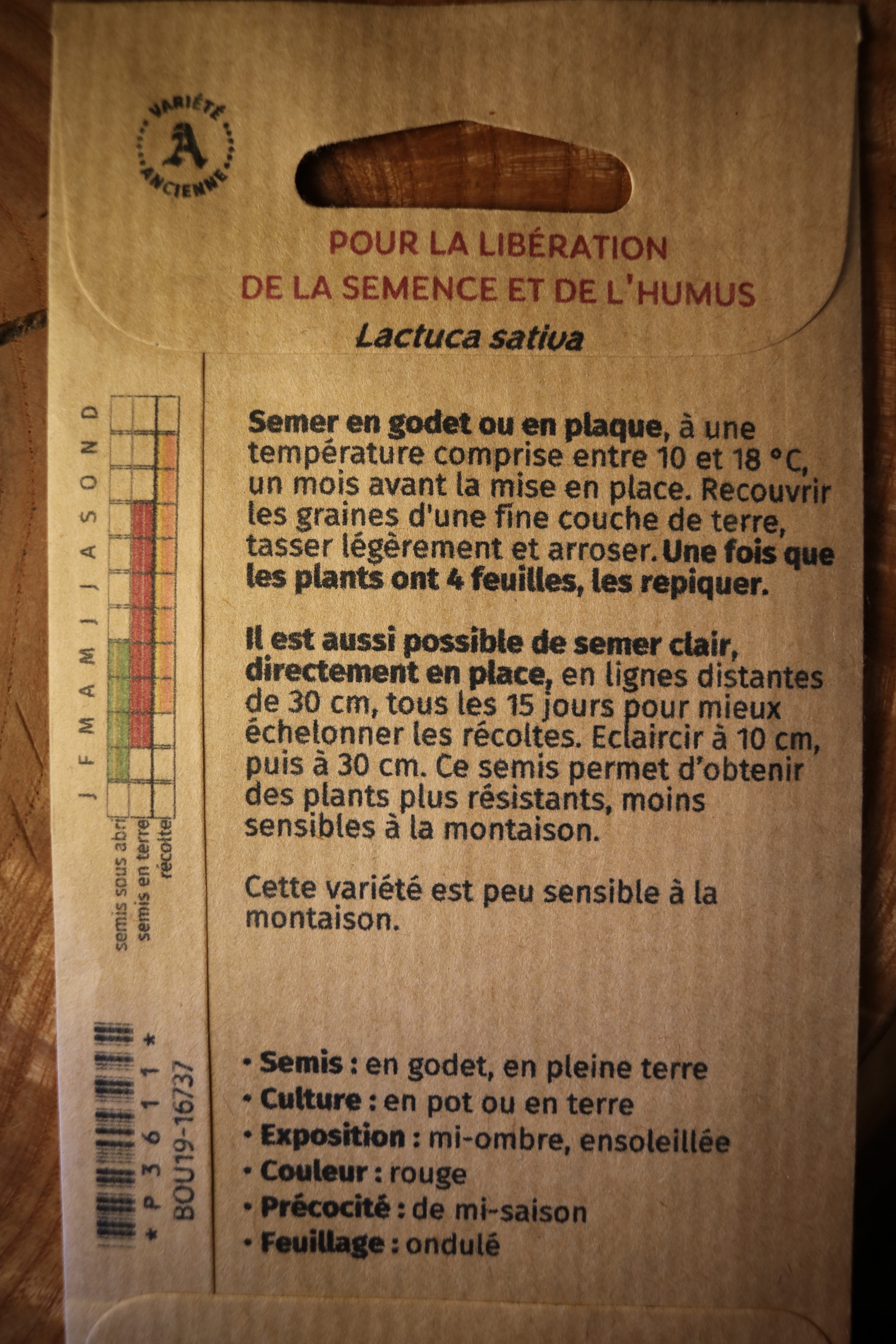 Diese sehr alte französische Sorte produziert grünrote Blätter, die einen großen, mäßig dichten Kopf mit knackiger Textur bilden. Aussaat unter Glass: Februar bis Mai. Im Freiland: März bis September. kbA 1 g von Kokopelli.