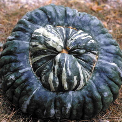 Mittelgroß, flachrund, graugrün. Form ähnlich Türkenturban. Herausragendes Aroma! Lagerkürbis.