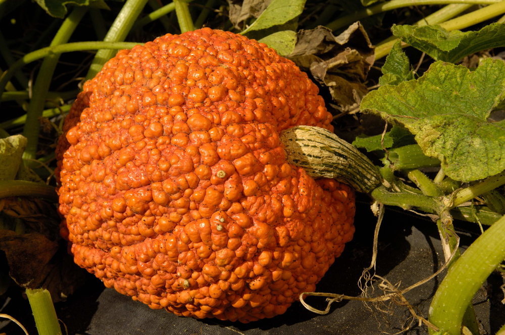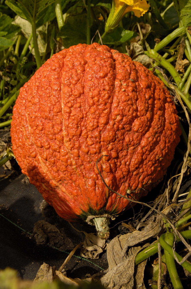 Schöne Früchte m. lebhaften orangefarbenen Farbspielereien,warzig,3-4 kg.Sehr schmackhaftes Fleisch.