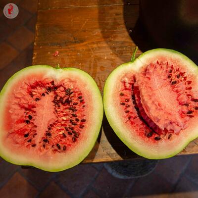 (Citrullus lanatus) Russland. Sehr frühe Sorte. Rund. 30 cm. Rosa Fruchtmark. Guter Geschmack.