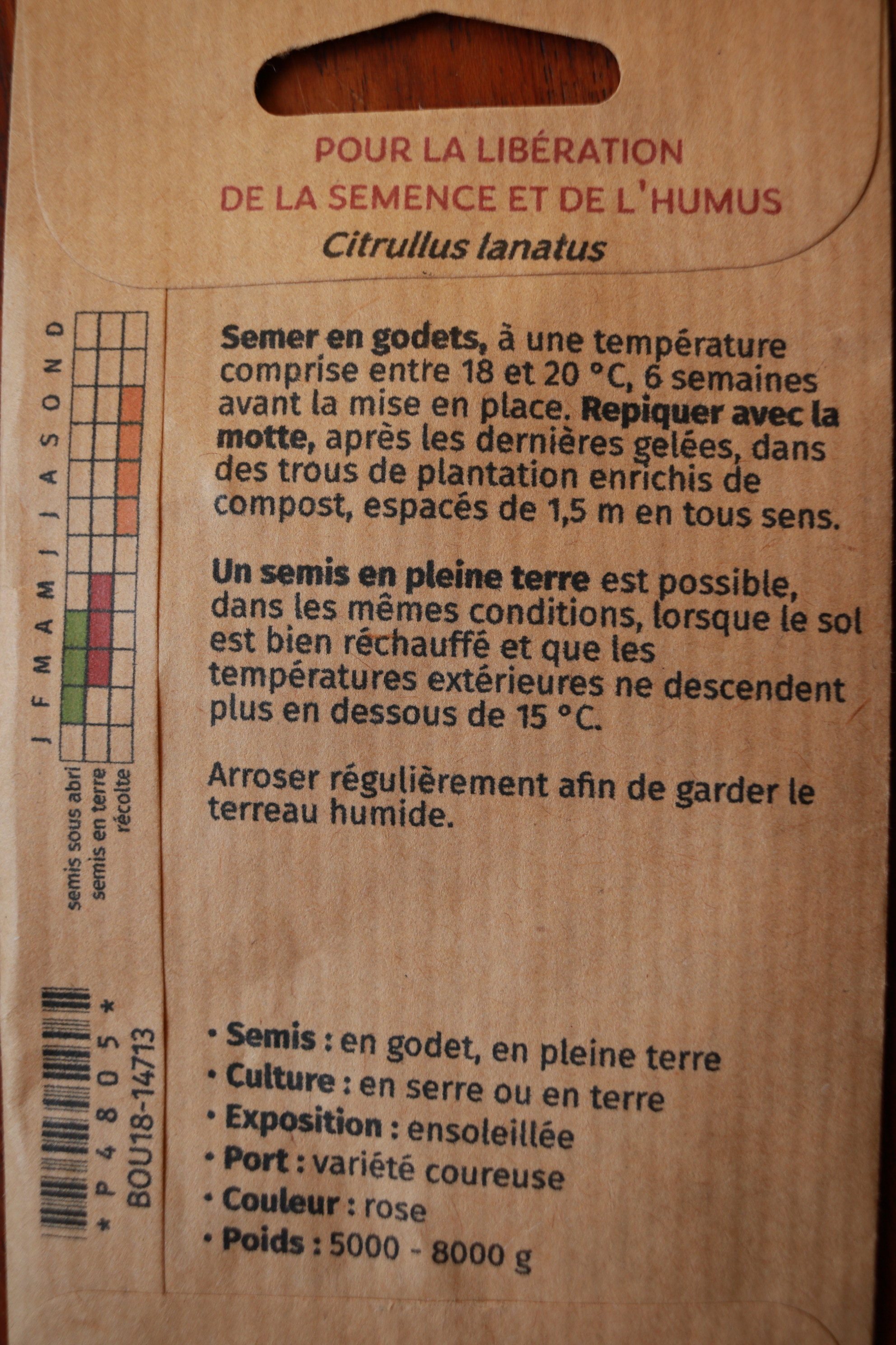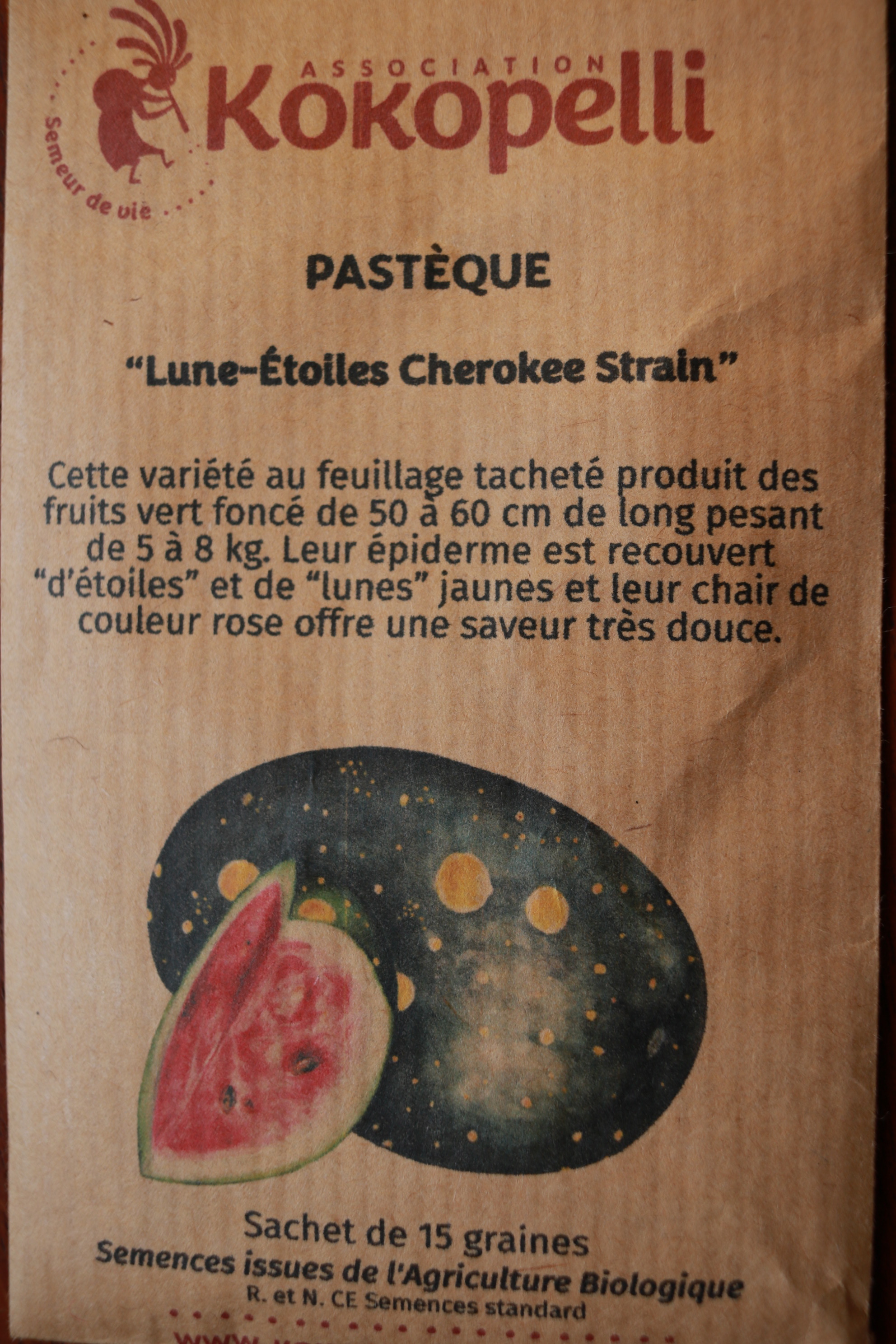 (Citrullus lanatus) Diese Sorte mit gesprenkeltem Laub produziert dunkelgrüne Früchte mit einer Länge von 50 bis 60 cm und einem Gewicht von 5 bis 8 kg. Die Haut ist mit gelben „Sternen“ und „Monden“ bedeckt und ihr rosa Fleisch hat einen sehr süßen Geschmack. Die Früchte werden 50-60 cm lang und erreichen ein Gewicht von 5-8 kg,