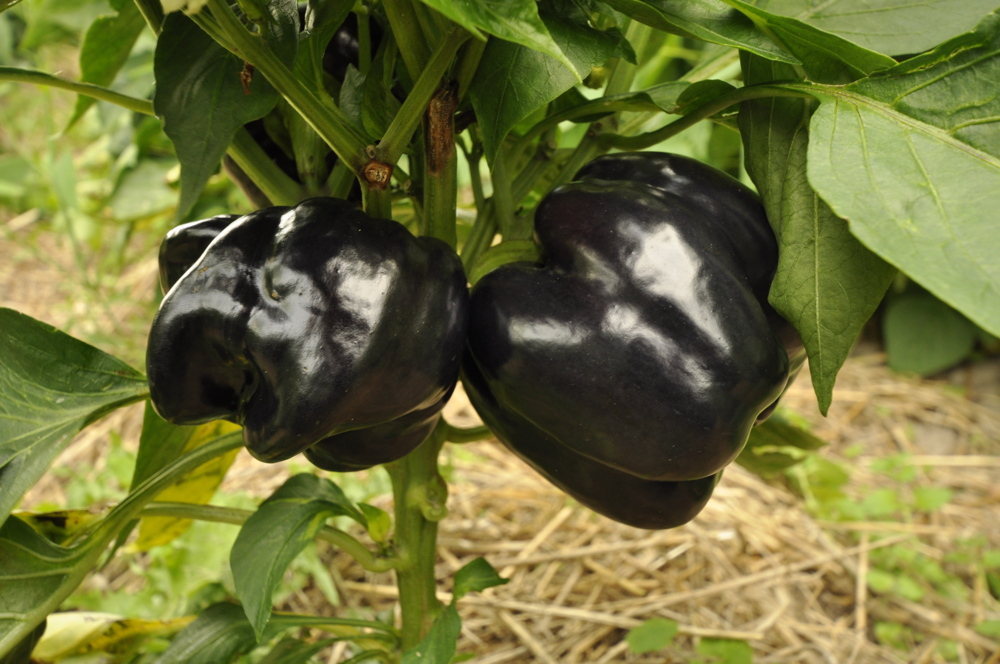 Amerika 1997. Etwa ein Dutzend Blockpaprikas, 8-9 cm, bis 250 g. Grün>>rot>>tiefviolett. Werden beim Kochen grün. Sehr süß und aromatisch. 50 cm hoch. Tabakmosaikvirusresistent. 70-75 Tage.