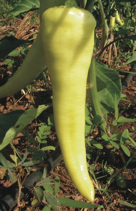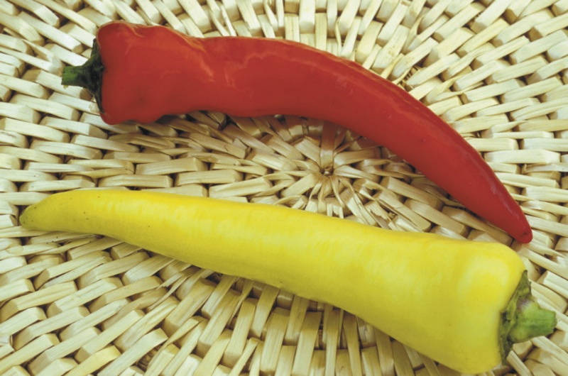 Traditionelle Sorte aus Ungarn. Außergewöhnlich, länglich, leuchtend gelbe Früchte in Form einer Banane (12-15 cm). Bei Vollreife rot. Saftig und geschmackvoll.