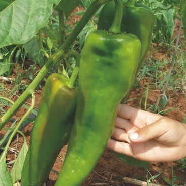 Nach dem Mount Aconcagua in Argentinien benannt. Riesenfrüchte, bis 30 cm lang, 320 g. Hellgrün. >>orange>>rot. Sehr saftig & aromatisch. Für Salate/Grill. Ertragreich. Fast 1m hoch. Stütze! 70-75 Tage.