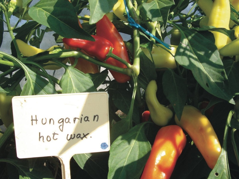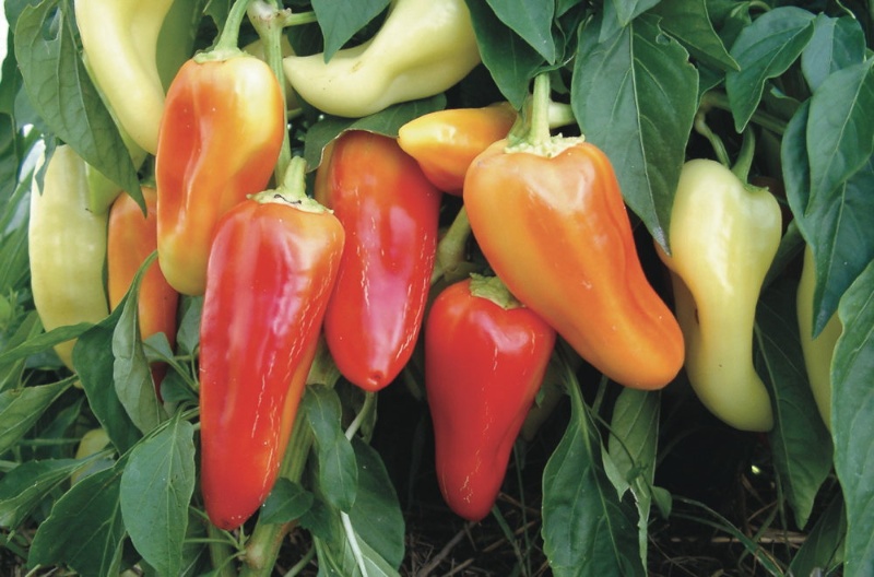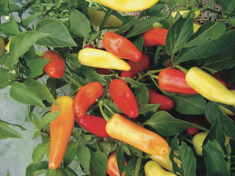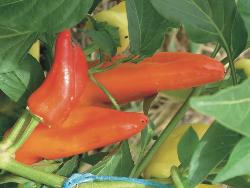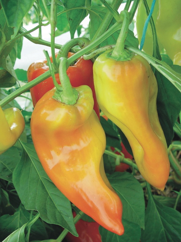 Wachspaprika. Lange Früchte, ideal zum Füllen. Gelb>rot.