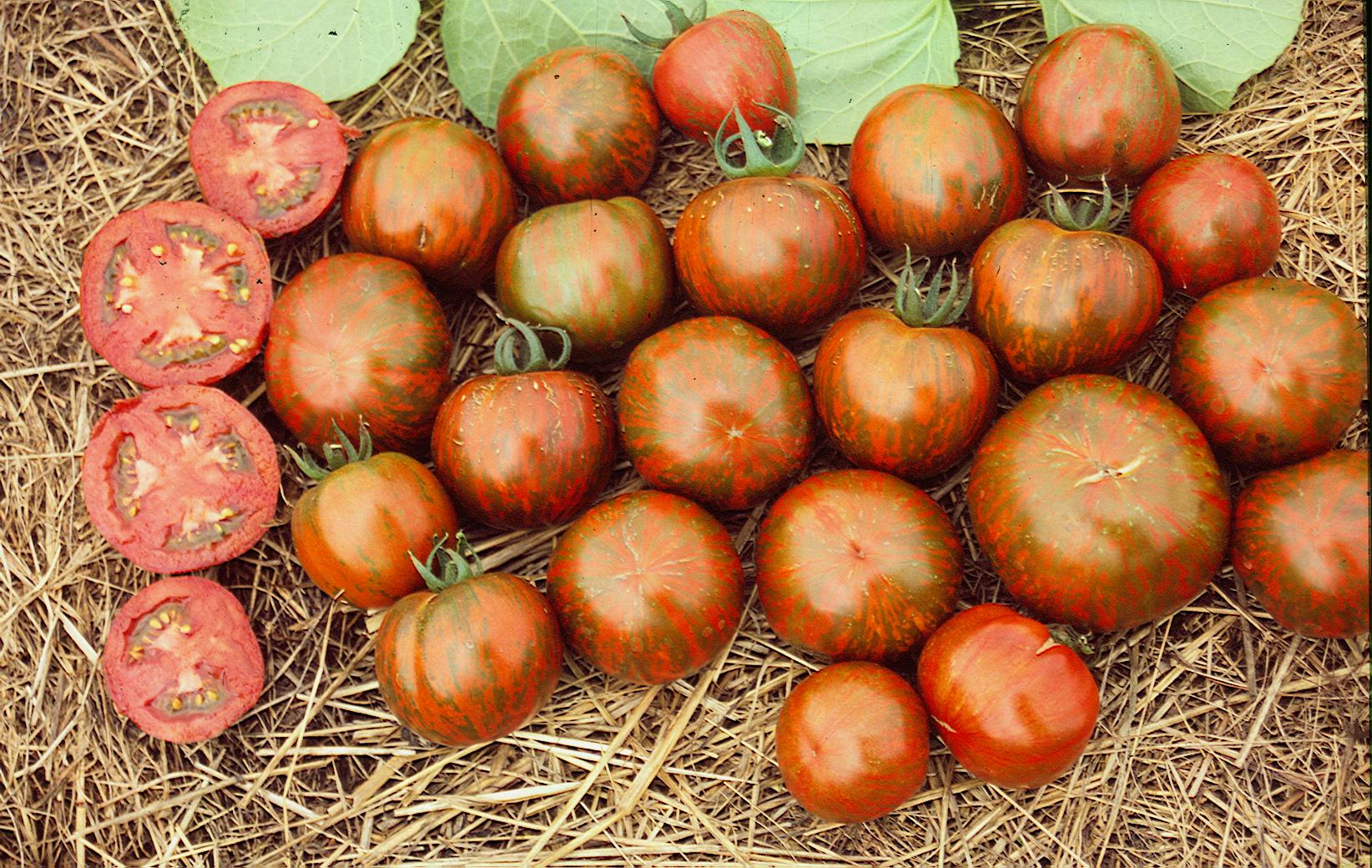 Spielerei von Tater Mater Seeds (Auslesezüchtung) aus den 80er Jahren. Runde Früchte, violett mit schwarzen Streifen, 4cm Ø. Volles, würziges Aroma. Stabtomate. 75 Tage. Inhalt: 15 Korn