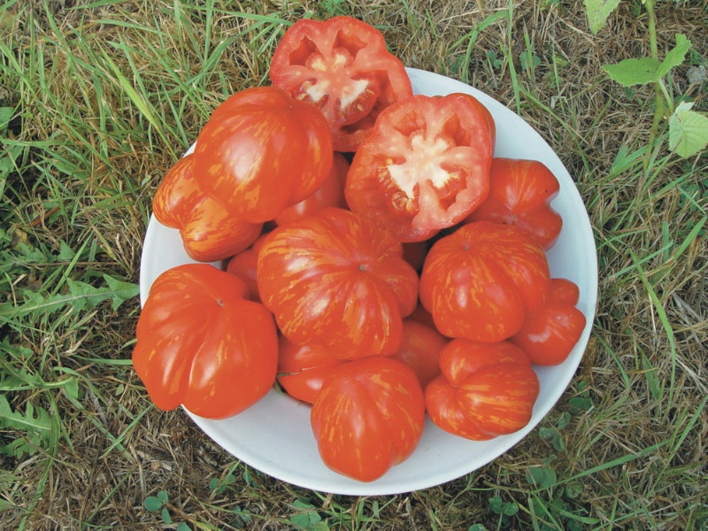 Hohle, orange-rot gestreifte Paprikaform. Wenig Kerne.Aromatisch. 200g . Sehr guter Geschmack. Stabtomate.Lagerfähig.kbA, Inhalt: 25 Korn