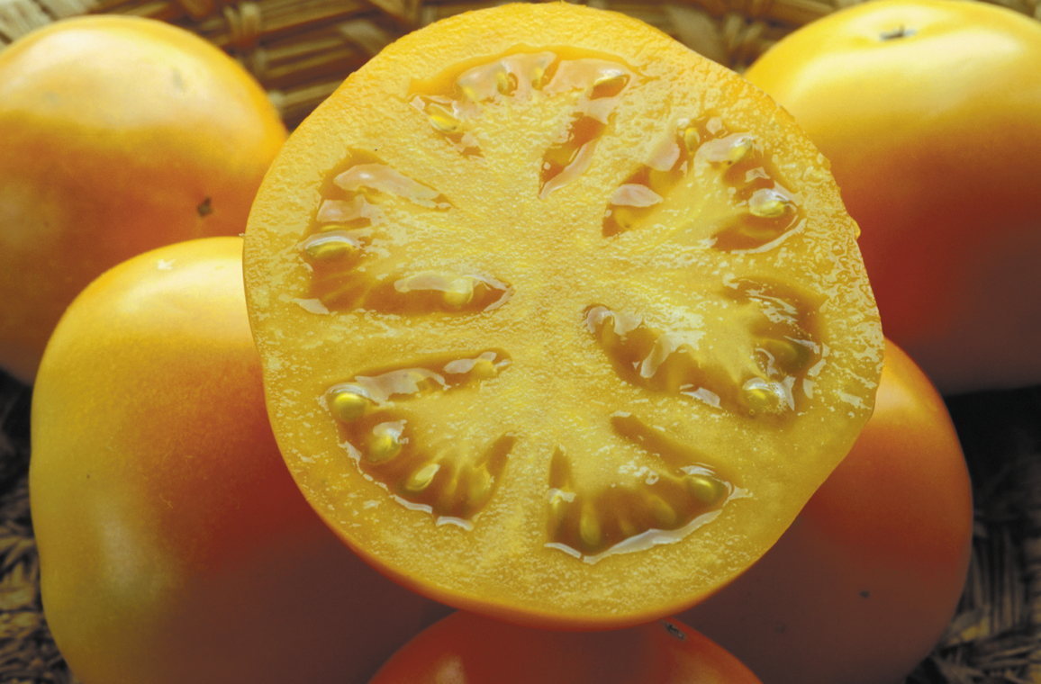 Orangegelbe, sehr frühe und sehr ertragreiche Buschtomate.Kleinere Fleischtomate.Mittelgroße, glatte nur mit angedeuteten Rippen versehene Früchte. Meist plattrund. Sehr schöne intensive Farbe.