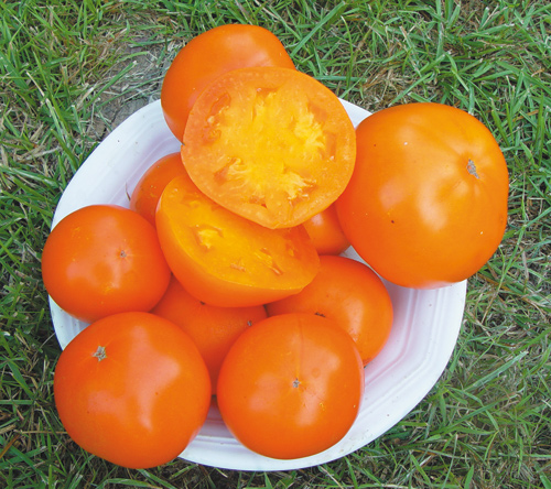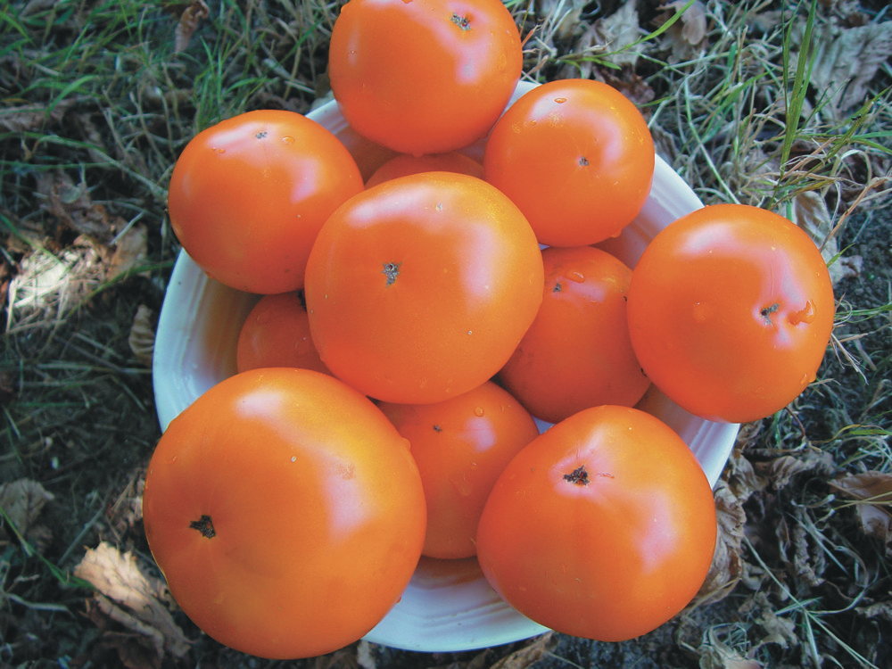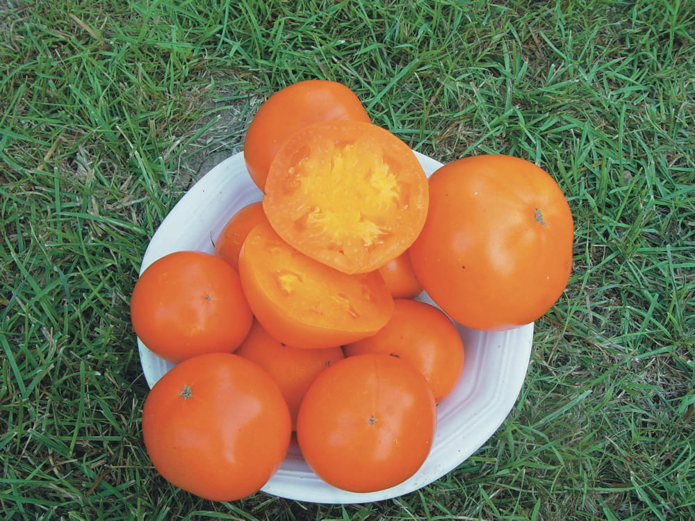Tolle, bis 10 cm große, dottergelbe bis gelborange, 2 Meter hohe Stabtomate. Plattrunde, große Frucht, die kaum gerippt ist. Kein Massenertrag, doch riesige Schaustücke von oft über 300 Gramm - meist 150 bis 300 Gramm.
