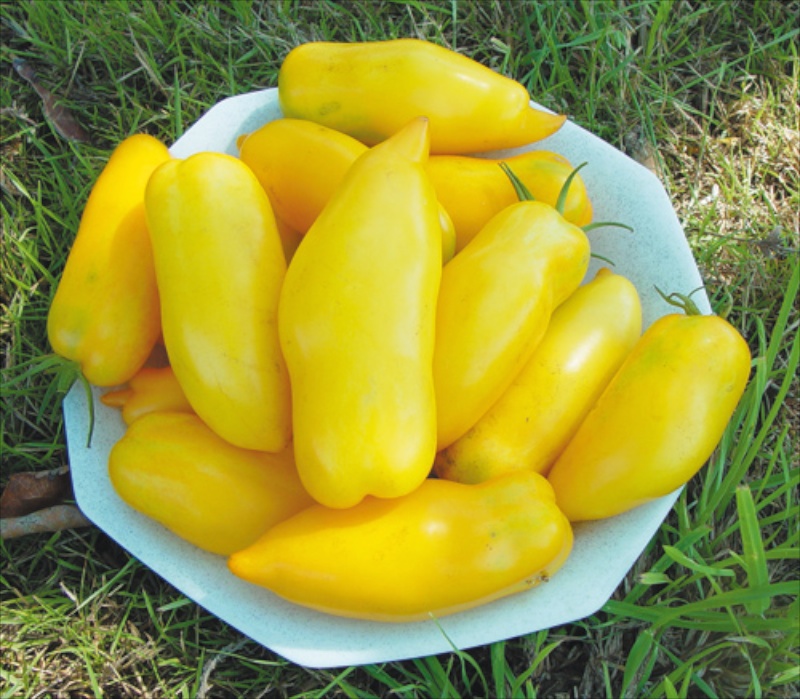 Leuchtend zitronengelbe, längliche, gewundene Früchte, 10 cm. Exzellentes Aroma. Stabtomate.... mehr