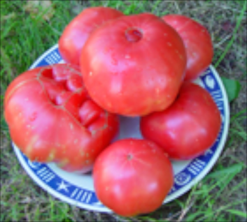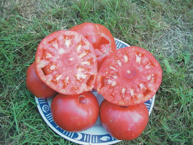 Rosarote bis lachsfarbene Fleischtomatemit sehr großen Früchten, die oft herzförmig oder etwas gerippt sind.Sehr fleischige Sorte aus Russland.
