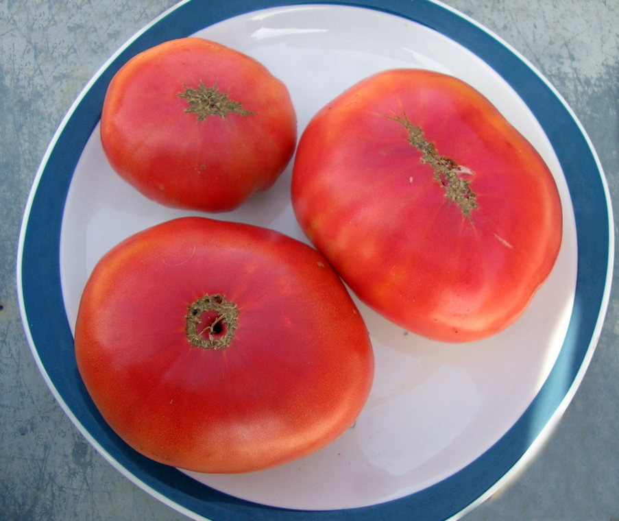 Lachsrote Ochsenherztomate. Pflanzen werden etwa 1,80m Früchte breitherzförmig bis klobig rund, extrem fleischig.Geschmack mild-süßlich mit geringem Säuregehalt.