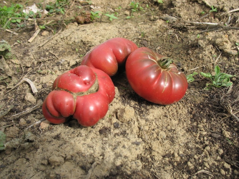 Violett-schokofarben. Riesenerträge. Gefurchte Tomate.
