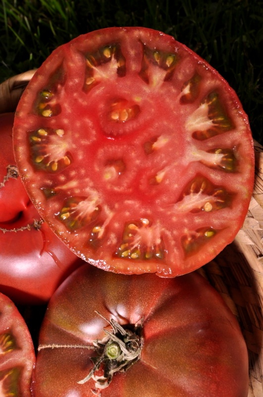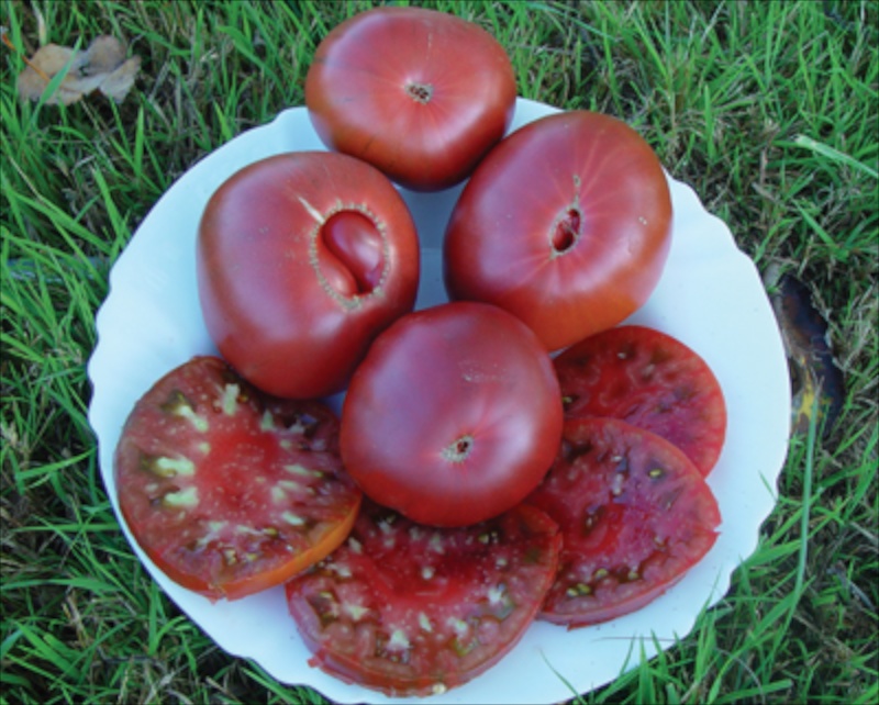 Wärmeliebend. Sehr ertragreiche Stabtomate. Wunderschön dunkel, rund.