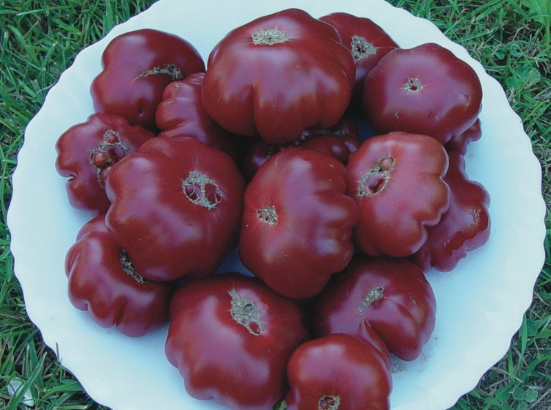 Violett-schokofarben. Riesenerträge. Gefurchte Tomate.