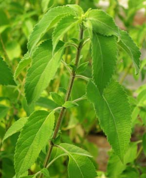 Diese heilige Basilika oder Tulsi kann bis zu 2,50 m hoch werden. Er ist sehr verzweigt und bietet eine Fülle grüner Blätter, fein und gezackt mit einem sehr würzigen Duft nach Kampfer und Nelke.