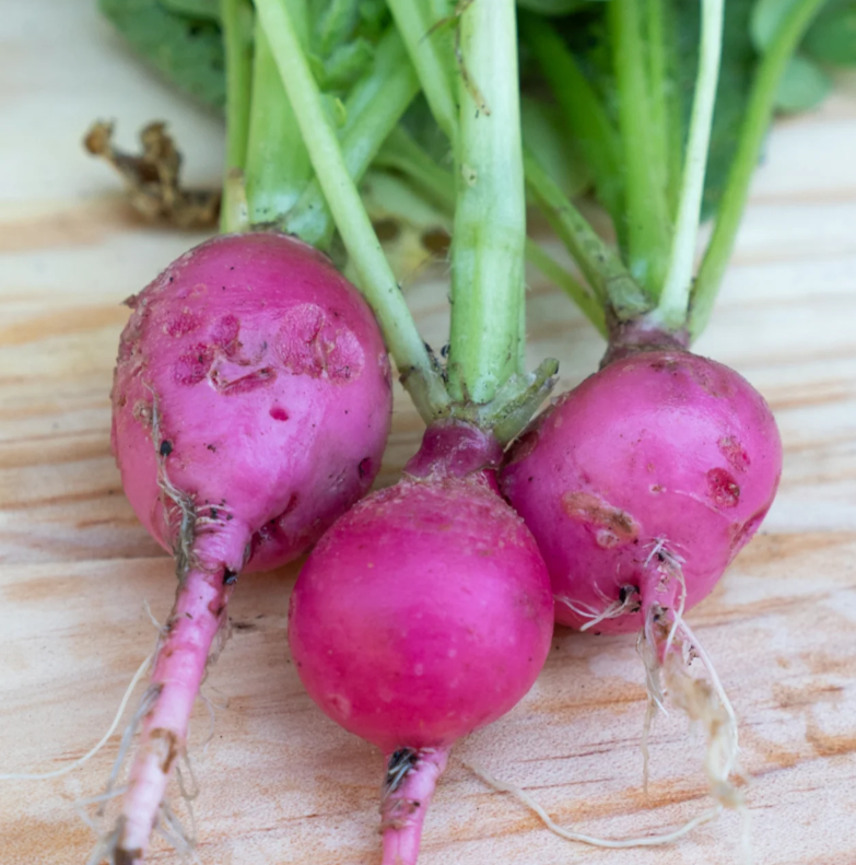 Sorte mit sehr dichtem Blattwerk, glänzend rosa Wurzeln, leicht oval, platzfest und sehr knackig.