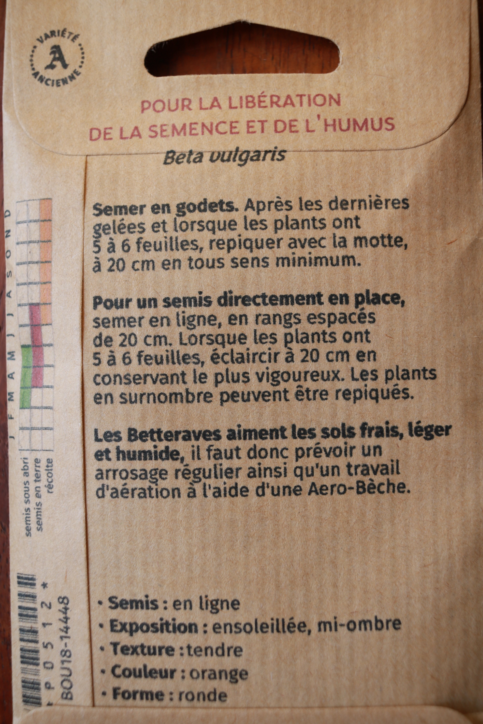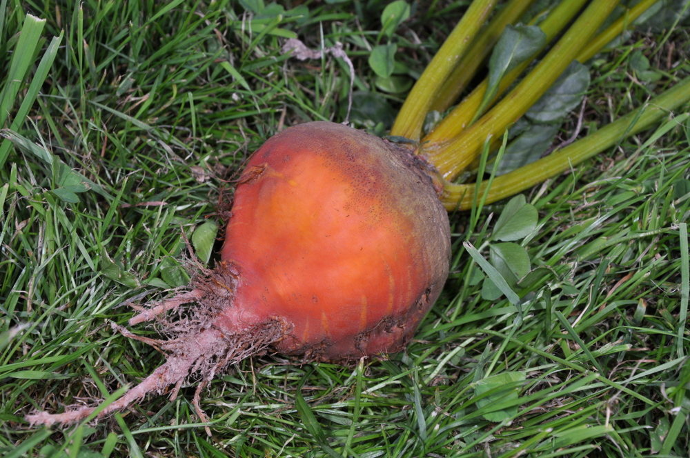 Besonderheit! Vor 1828, runde, gelbe Bete. Fein und sehr zart. Blätter wie Mangold. Orangefarbene, runde Wurzel mit goldgelbem Fleisch mit mildem Geschmack. Man kann sie klein ernten und in Essig einlegen. Die Blätter haben einen exzellenten Geschmack, süss und duftend. Aussaat bis Juli.