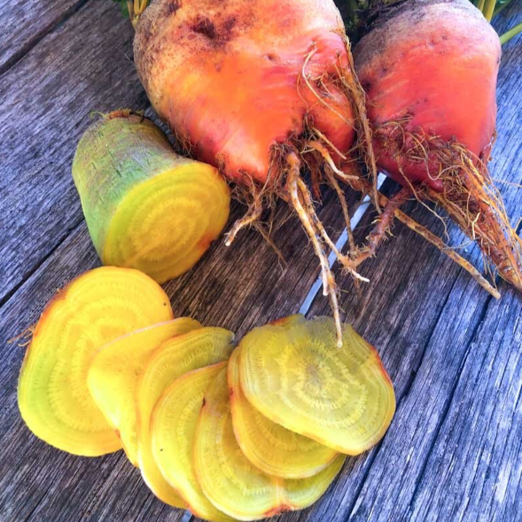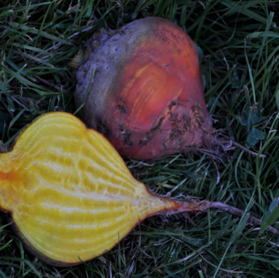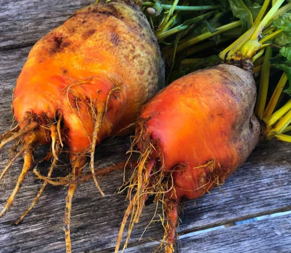 Besonderheit! Vor 1828, runde, gelbe Bete. Fein und sehr zart. Blätter wie Mangold. Orangefarbene, runde Wurzel mit goldgelbem Fleisch mit mildem Geschmack. Man kann sie klein ernten und in Essig einlegen. Die Blätter haben einen exzellenten Geschmack, süss und duftend. Aussaat bis Juli.