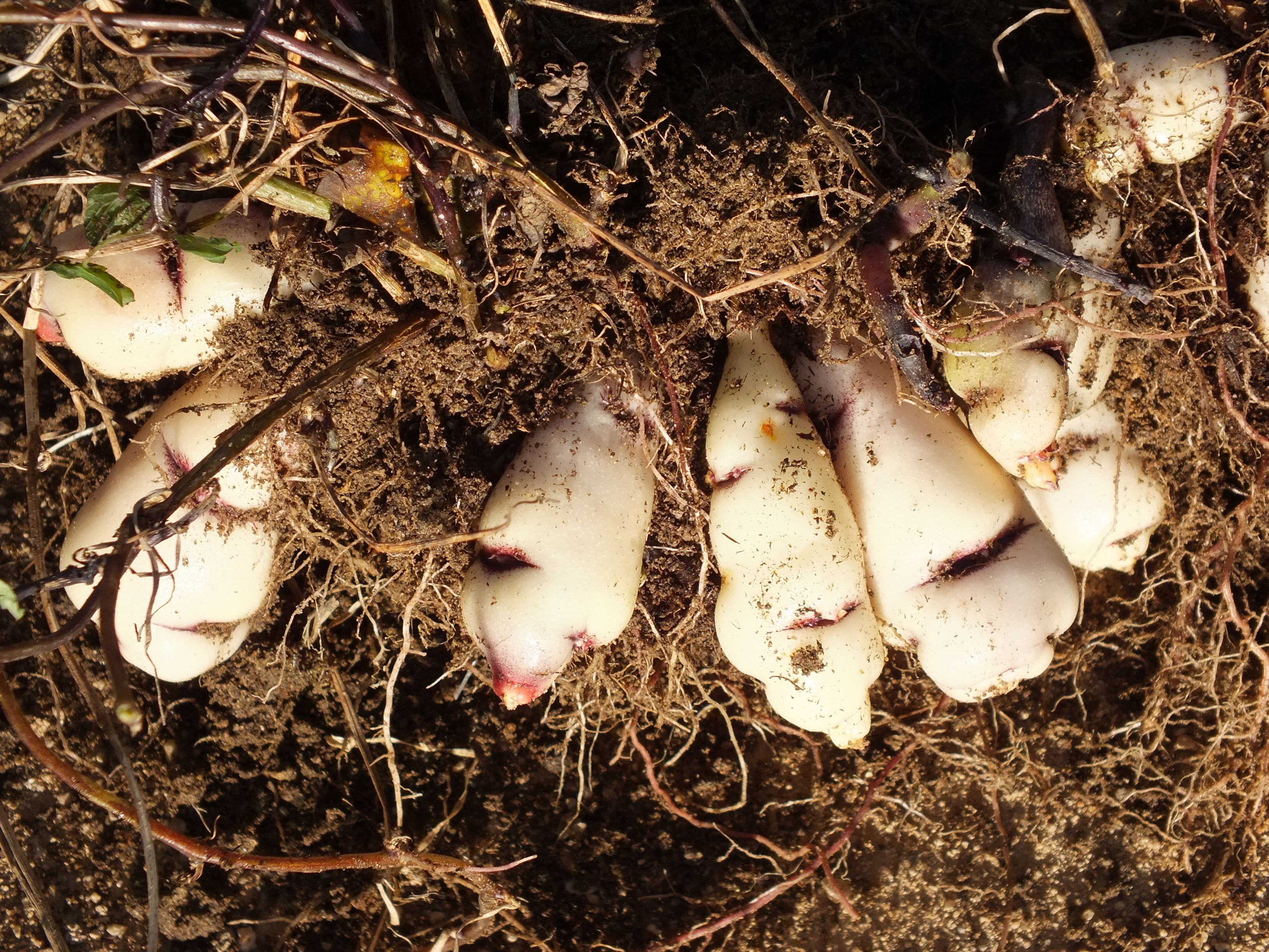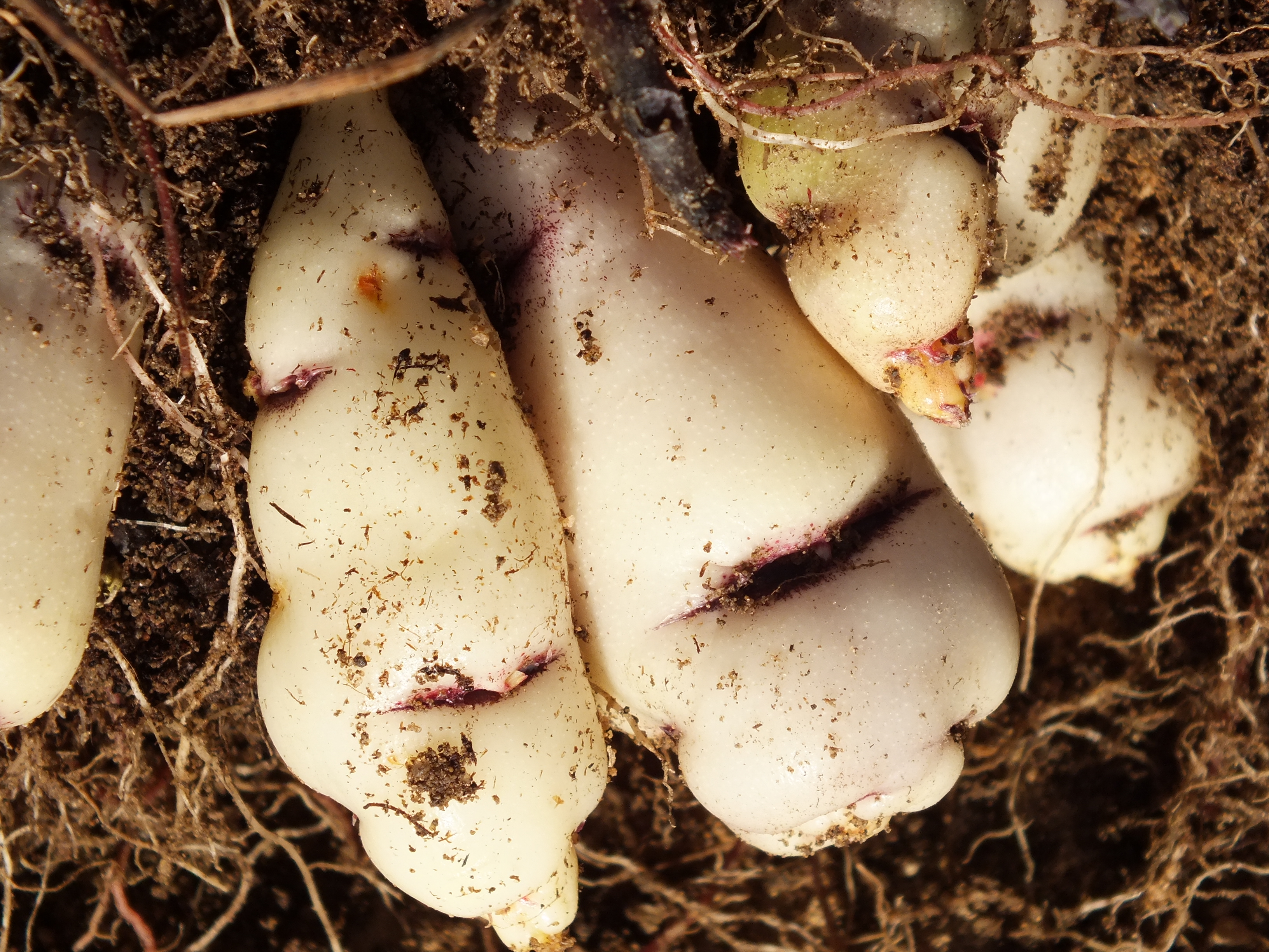 Es gibt weiße Knollen mit violetten Streifen an den Augen, rötliche Knollen und gelbliche Knollen.