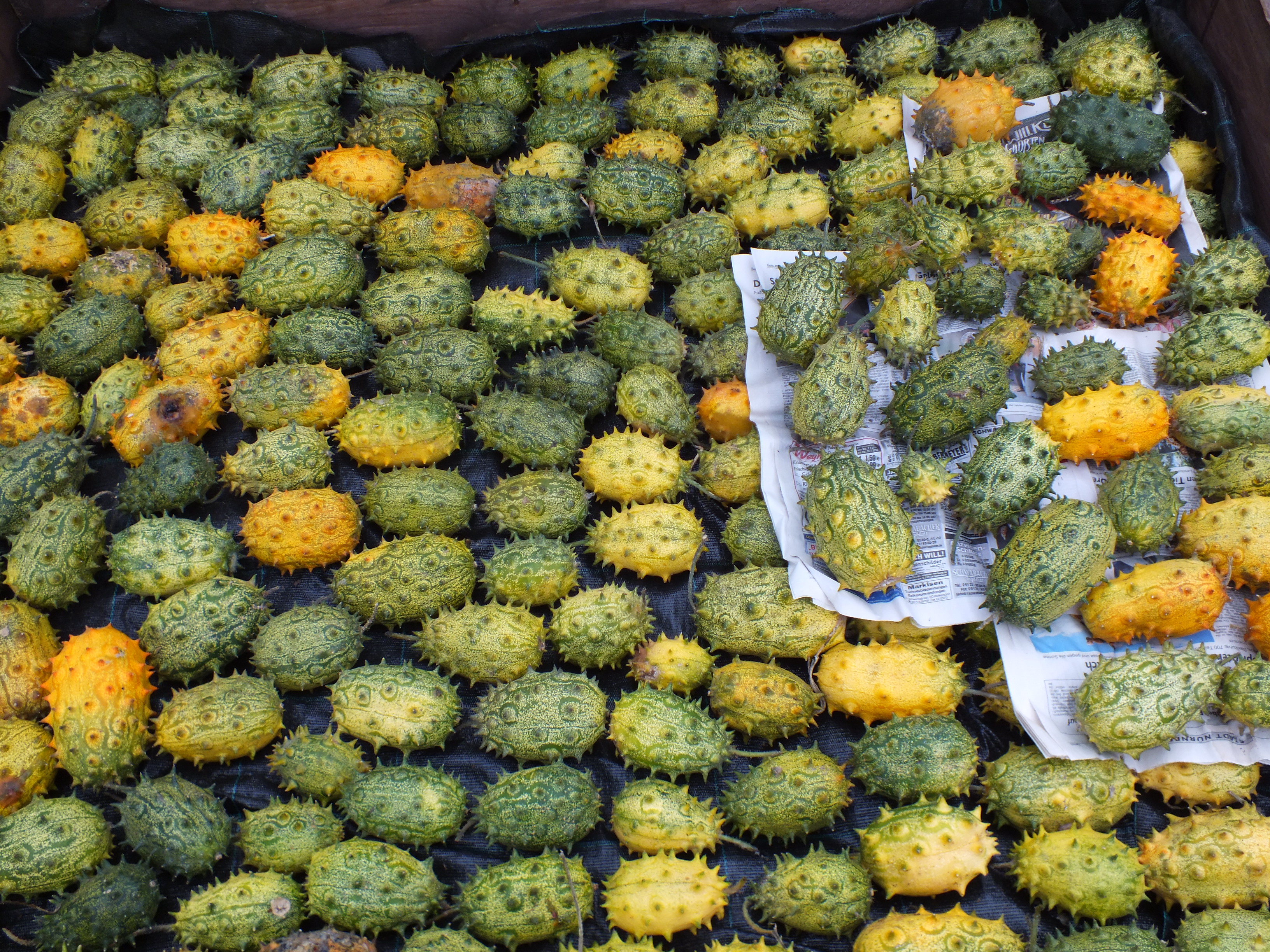 Der in Afrika südlich der Sahara beheimatete Kiwano (Cucumis metuliferus) produziert ovale Früchte mit sehr scharfen Spitzen. Die Haut wird im reifen Zustand bronze-rot und das grüne Fruchtfleisch bietet eine saftige Textur mit einem ähnlichen Geschmack wie Kiwi und Banane. Kiwano wird roh oder gegrillt gegessen. Er hat einen sehr hohen Vitamin C-Gehalt. Neuere medizinische Untersuchungen haben gezeigt, dass es Cucurbitacin B enthält, ein Triterpen, das für seine zytologischen, entzündungshemmenden und krebsbekämpfenden Eigenschaften bekannt ist.