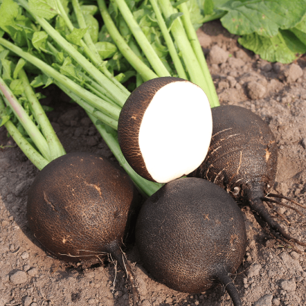 Black Spanish Round: Dieser schwarze Rettich erreicht einen Durchmesser von 13 cm. Es ist ein Winterrettich der wahrscheinlich aus dem 16. Jahrhundert oder noch früher stammt. Er hat schwarze Haut und schneeweißes Fleisch und ist leicht scharf. Er kann ohne Probleme den ganzen Winter über in gutem Zustand gelagert werden. 100 Samen aus biologischem Anbau.