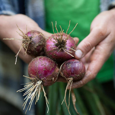 Eine sehr süße Zwiebel, rund und rosa. Sie ist auf der Insel Oléron beheimatet und wird "Rosé des Sables" genannt. Bis zu 8 Monaten lagerbar.