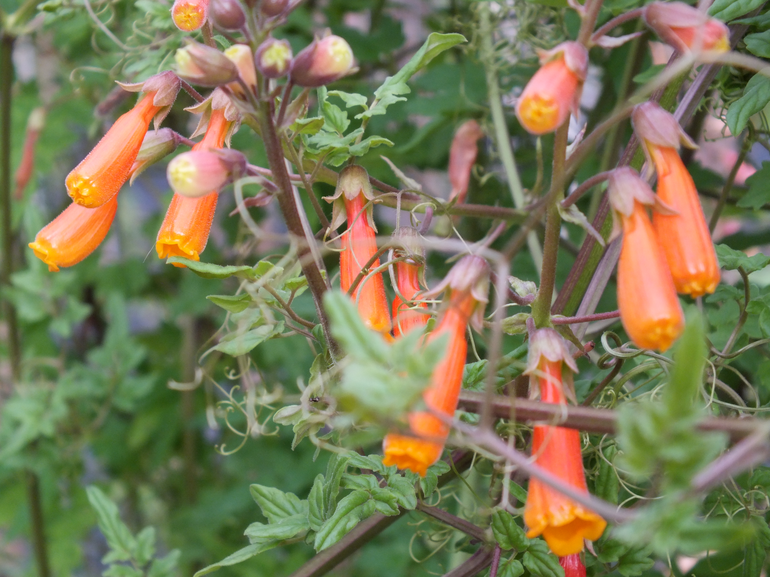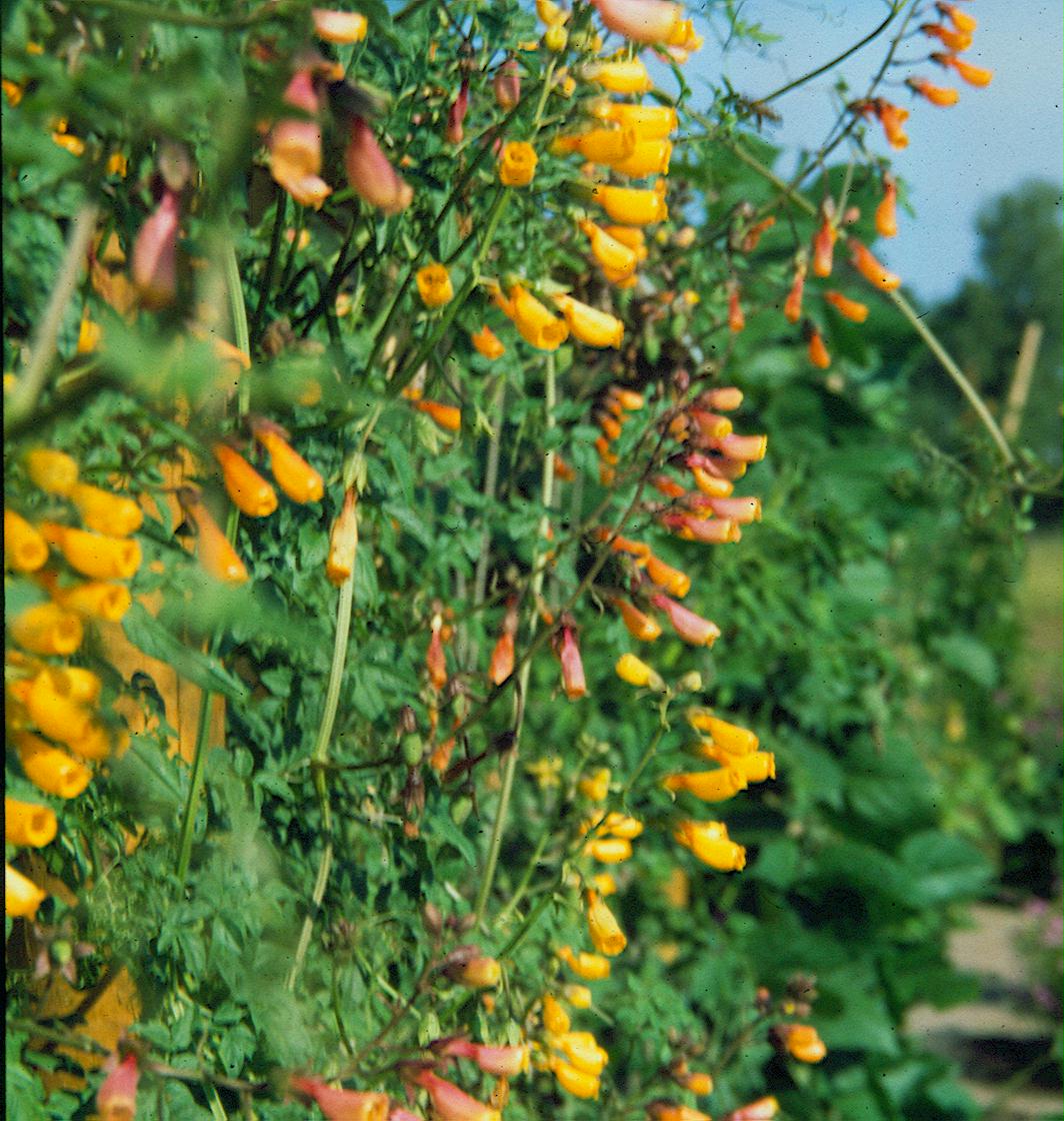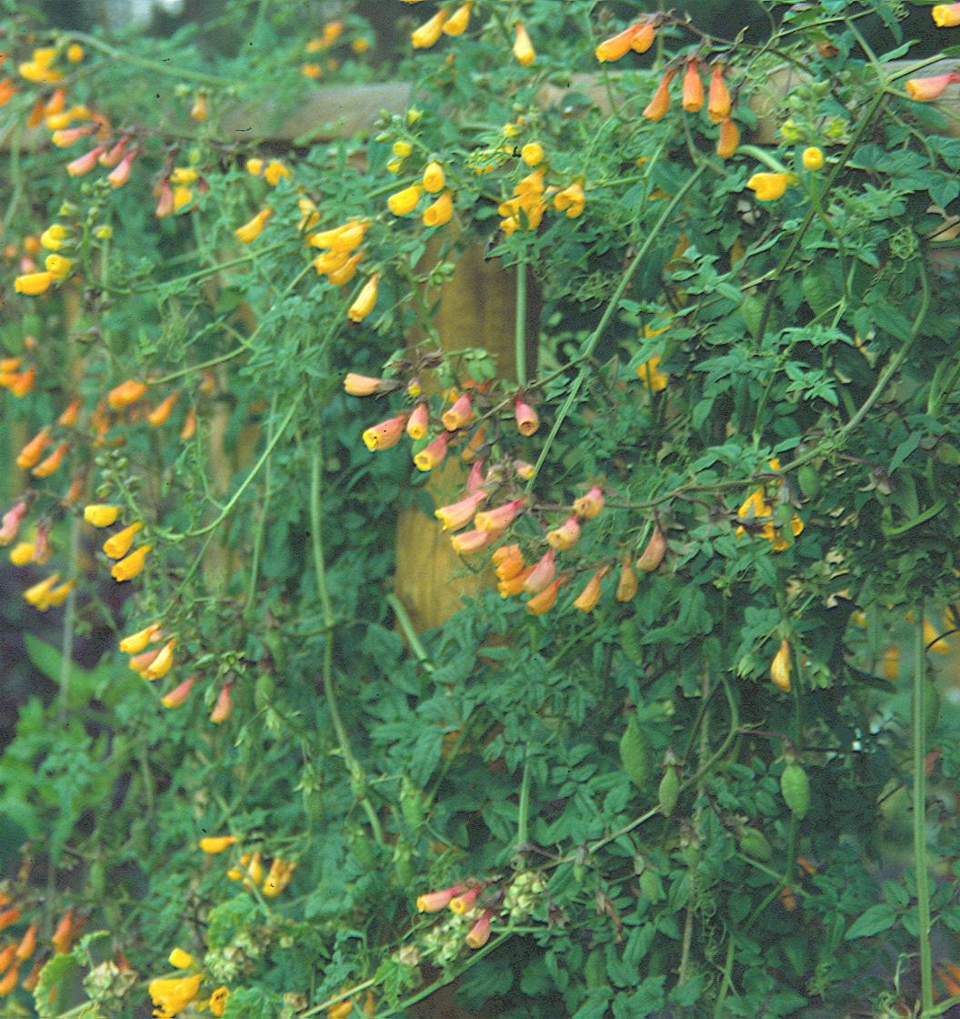 Eccremocarpus scaber - Schönranke, Mischung zarter Farben Zarte, doch robuste Kletterpflanze für Balkon, Terrasse, Spaliere und höhere Gartenzäune. Herrliche, in Trauben stehende Röhrenblüten von gelber bis roter Farbe, zumeist orange-gelb blühend. Frostfrei überwinterte Pflanzen blühen früher und wachsen kräftiger (oft über 4 Meter hoch). Trotz ihrer Zartheit ist die Schönranke eine überaus robuste Freiland-Kletterpflanze. Bei einer Kultur auf Balkon oder Terrasse hat man auch keinen Schmutz aufgrund abfallender Blätter (auch nach dem Frost nicht), allenfalls fällt Verblühtes ab. Die Schönranke sollte man dort pflanzen, wo man sie in Ruhe betrachten kann. Sie klettert völlig selbstständig und muss auch nicht hochgebunden werden. Eine tolle Kletterpflanze mit einer extrem langen Blütezeit von Juni bis über die ersten Fröste hinaus. Der Wurzelstock kann milde Winter unter einer Laubschicht überleben. Wer den Wurzelstock nicht frostfrei im Haus überwintern kann, sollte die Schönranke an eine Hauswand pflanzen und den Wurzelstock zu Winterbeginn dick mit Laub abdecken. Ende März (je nach Witterung auch schon etwas früher) muss der Winterschutz wieder entfernt werden und die Pflanze kann durch Vorstellen einer Glasscheibe oder Überstülpen mit einer Folie angetrieben werden.