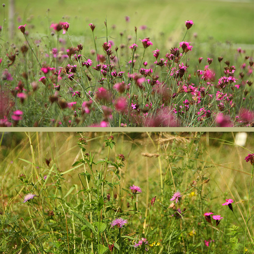 Pflege: Ein- bis zweimalige Mahd (Ende Juni u. evtl. im Sept.) Ansaat:2 g / m² Kräuteranteil 50%