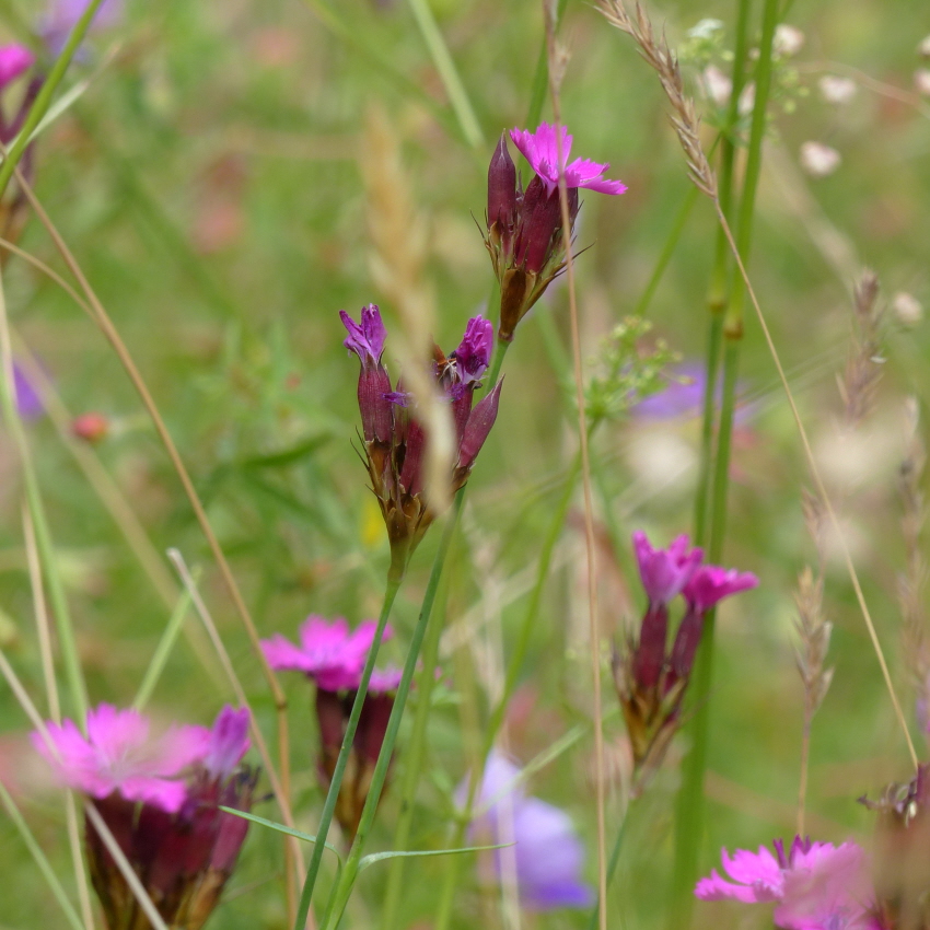 Karthäusernelke, Echtes Labkraut, Echtes Johanniskraut, Wiesenwitwenblume, Rauher Löwenzahn, Wiesenmargerite,