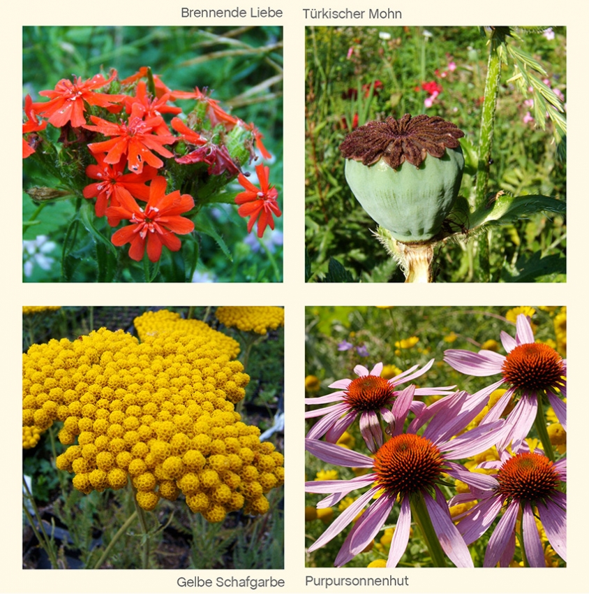 Enthaltene Arten: Stockmalve, Jupiternelke, Röm. Kamille, Echter Alant, Türkenmohn, Purpursonnenhut, Brennende Liebe, Mutterkraut, Muskatellersalbei, Telekie, Lobelie, Hohes Helmkraut.