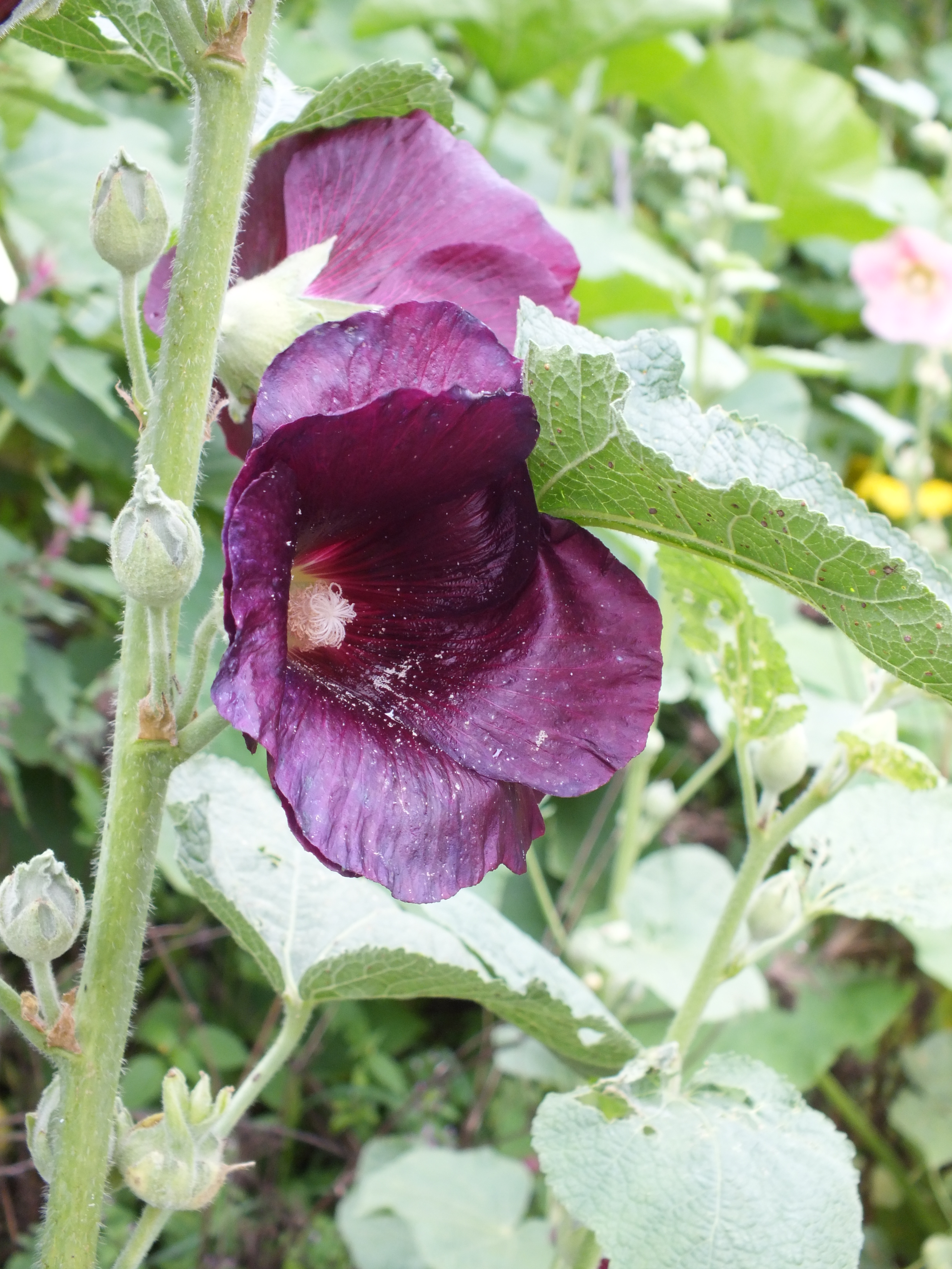 Diese Form der Stockrose hat schwarzviolette, nicht gefüllte Blüten. Sie war früher eine Heil- und Färbepflanze und noch heute werden die Blüten in Hustentees verwendet. Meist besserer und gesünderer Wuchs als die helleren Formen. 2 Meter hoch wachsend. An günstigen Standorten zumeist mehrjährig werdend, im Lauf der Jahre üppiger wachsend. Dekorativ vor hellem Hintergrund und an Gartenzäunen.